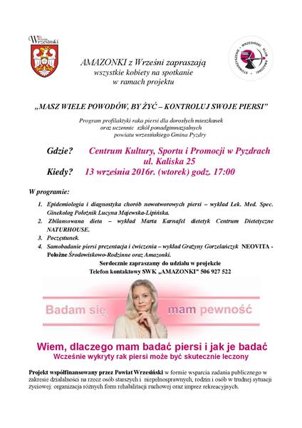 Amazonki z Wrześni zapraszają wszystkie kobiety na spotkanie w ramach projektu „Masz wiele powodów, by żyć – kontroluj swoje piersi”. Program profilaktyki raka piersi dla dorosłych mieszkanek oraz uczennic szkół ponadgimnazjalnych powiatu wrzesińskiego Gmina Pyzdry. Spotkanie odbędzie się 13 września o godz. 17:00 w CKSiP w Pyzdrach.
