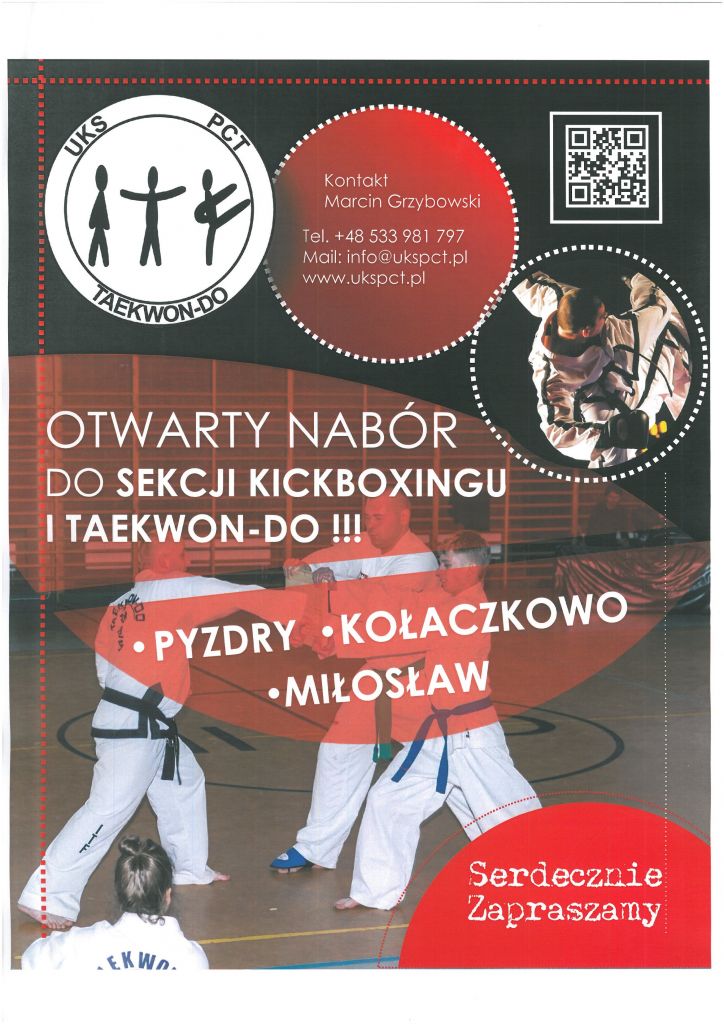 UKS PCT otwiera nabór do sekcji taekwon-do i kickboxingu dla dzieci i młodzieży. Zajęcia odbywać będą się w Szkole Podstawowej w Pyzdrach we wtorki i czwartki (godz.17:00 - 18.00 - gr. I) i ( godz.18.00-19:00 - gr.II). Pierwszy trening 6 września tj. wtorek godz.17:00