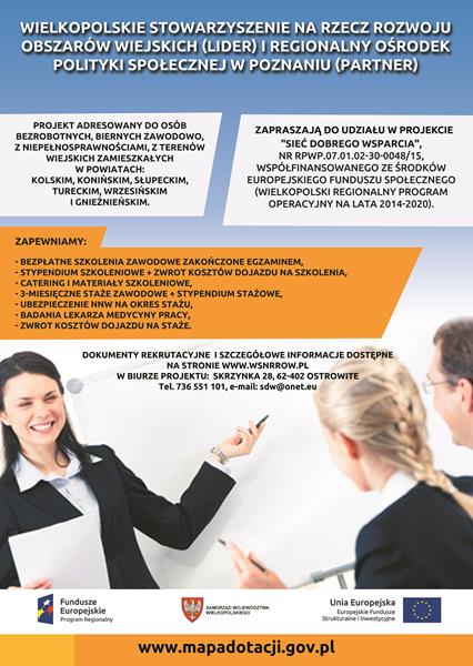 Wielkopolskie Stowarzyszenie na Rzecz Rozwoju Obszarów Wiejskich w partnerstwie z Regionalnym Ośrodkiem Polityki Społecznej w Poznaniu, na terenie subregionu konińskiego realizuje projekt pn.: "Sieć Dobrego Wsparcia".