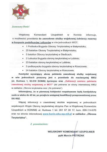 Więcej informacji o zawodowej służbie wojskowej w jednostkach Wojsk Obrony Terytorialnej można pozyskać na stronie internetowej: http://konin.wku.wp.mil.pl/pl/13673.html