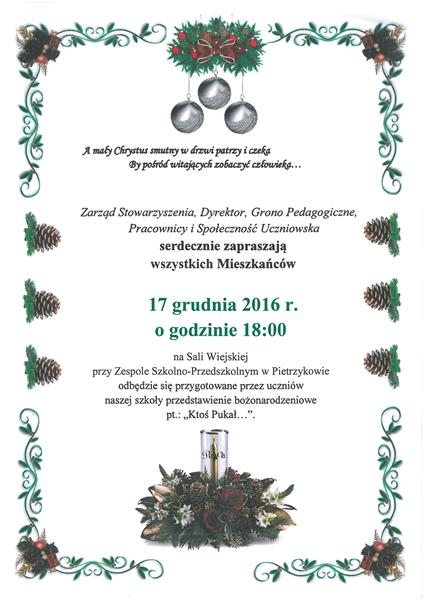Przedstawienie bożonarodzeniowe pt. „Ktoś Pukał...” odbędzie się 17 grudnia o godz. 18:00 w Sali Wiejskiej przy Zespole Szkolno-Przedszkolnym w Pietrzykowie.