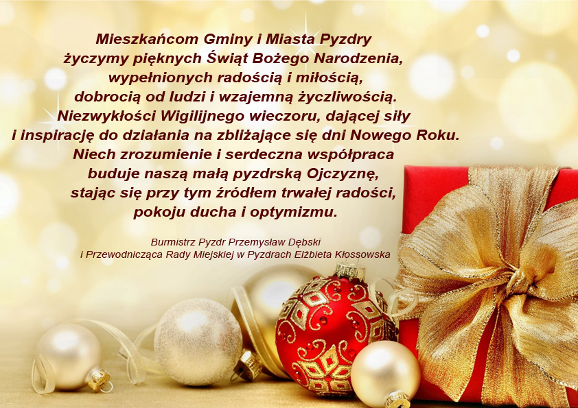 Burmistrz Pyzdr i Przewodnicząca Rady Miejskiej w Pyzdrach składają Mieszkańcom Gminy serdeczne życzenia z okazji Świąt Bożego Narodzenia.