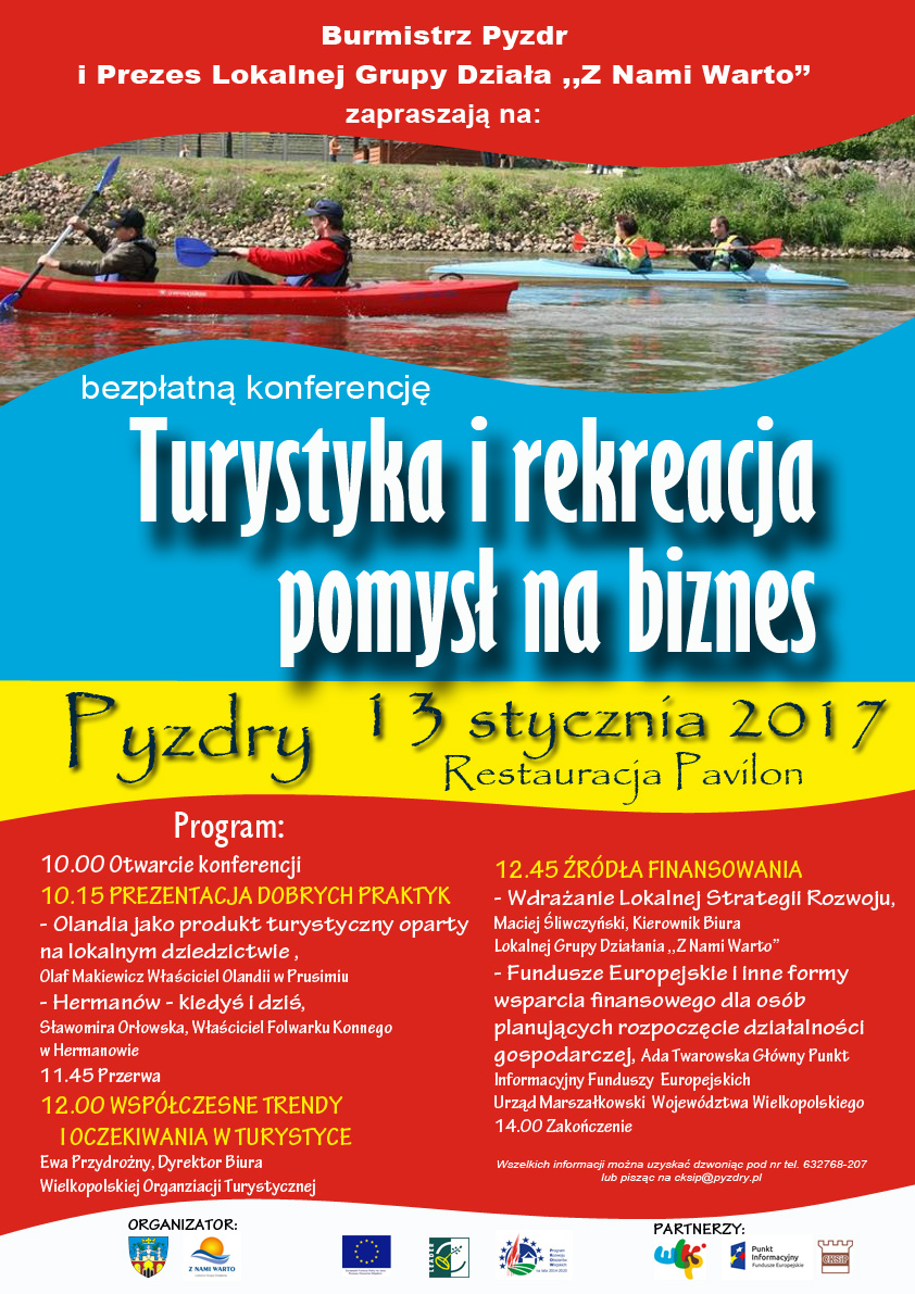 Burmistrz Pyzdr i Prezes Lokalnej Grupy Działania ,,Z Nami Warto'' serdecznie zapraszają do udziału w konferencji ,,Turystyka i rekreacja – pomysł na biznes'', zaplanowanej na 13 stycznia 2017 r.