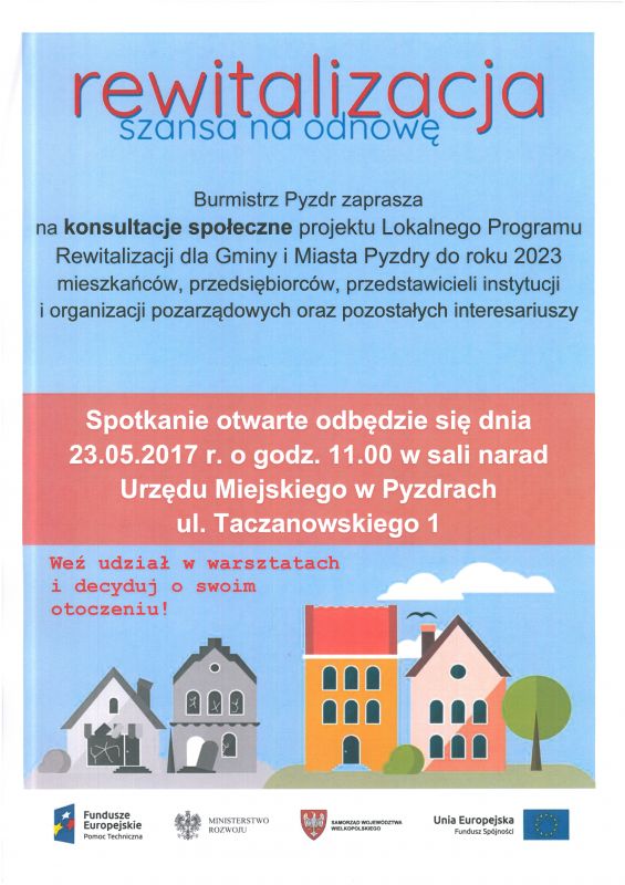 Burmistrz Pyzdr zaprasza na warsztaty rewitalizacyjne mieszkańców, przedsiębiorców, przedstawicieli instytucji i organizacji pozarządowych oraz pozostałych interesariuszy w ramach opracowywanego Lokalnego Programu Rewitalizacji dla Gminy i Miasta Pyzdry do roku 2023