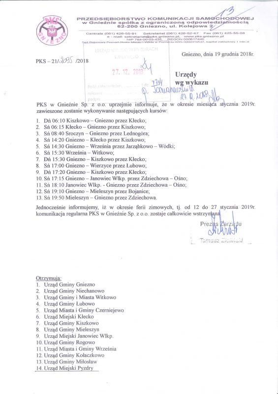 W nawiązaniu do informacji PKS Gniezno o całkowitym wstrzymaniu komunikacji regularnej w okresie ferii zimowych tj od 12 do 27 stycznia 2019 r. informujemy o uruchomieniu bezpłatnych połączeń zastępczych w w/w okresie realizowanych przez FHU. ,,WA-MA" Maciej Walicki.