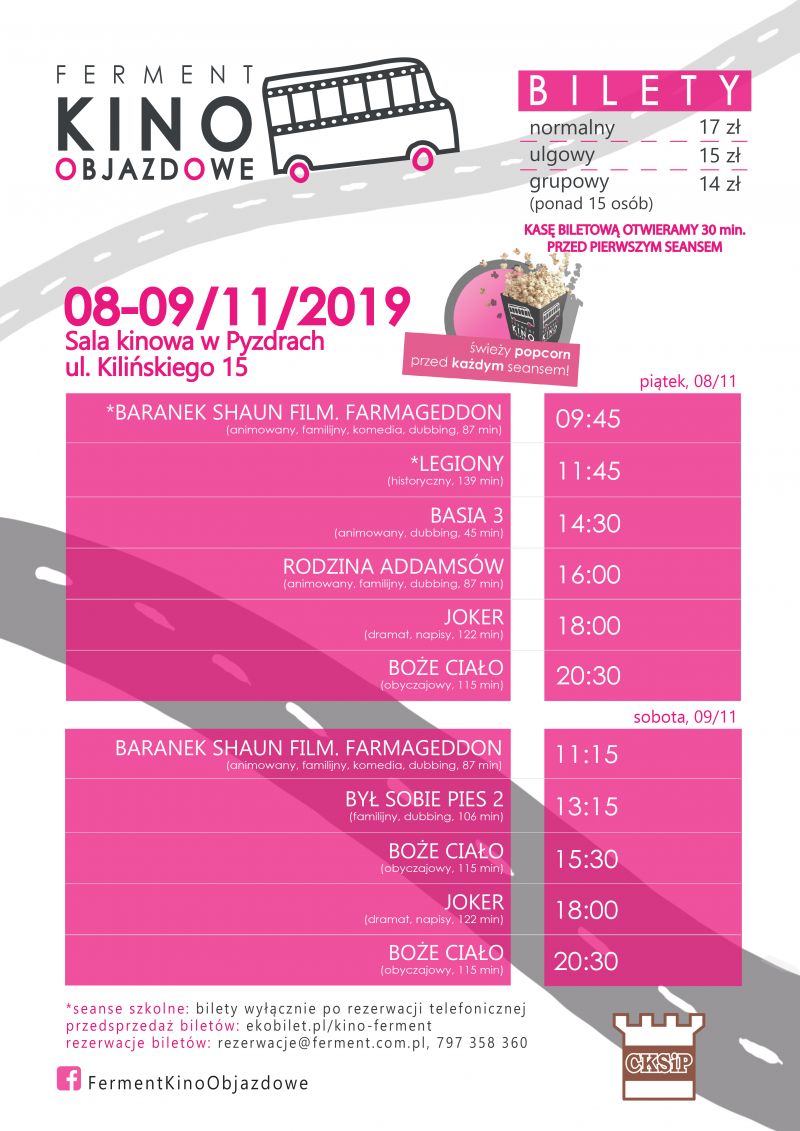 Zgodnie z wcześniejszą zapowiedzią serdecznie zapraszamy na seanse filmowe w pyzdrskim kinie. Aby realizować to ważne dla Was przedsięwzięcie podjęliśmy współpracę z Ferment Kino Objazdowe. Startujemy już w najbliższy weekend, tj. 8 i 9 listopada. W załączeniu prezentujemy repertuar.