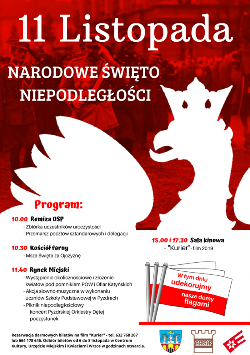Burmistrz Pyzdr serdecznie zaprasza mieszkańców pyzdrskiej gminy do czynnego udziału w uroczystych obchodach Święta Niepodległości.