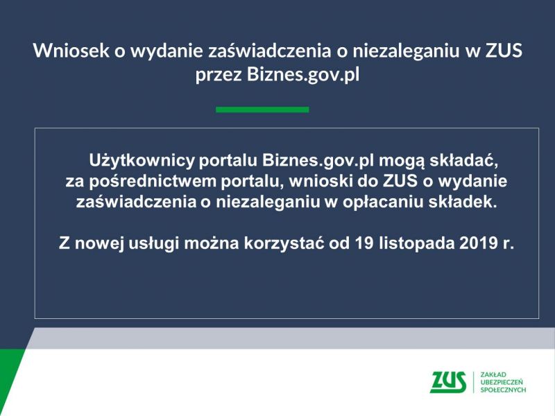 Użytkownicy portalu Biznes.gov.pl mogą składać, za pośrednictwem portalu, wnioski do ZUS o wydanie zaświadczenia o niezaleganiu w opłacaniu składek.