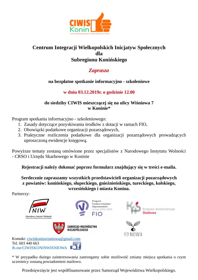 Członkowie organizacji pozarządowych mogą wziąć udział w bezpłatnym spotkaniu informacyjno-szkoleniowe, które odbędzie się w dniu 3 grudnia o godzinie 12.00 w Centrum Integracji Wielkopolskich Inicjatyw Społecznych w Koninie. Poniżej zamieszczamy link do rejestracji: