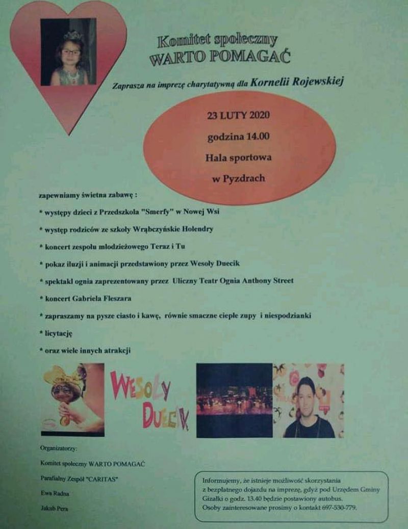 Impreza, zorganizowana w hali, była połączeniem części artystycznej z licytacją gadżetów. Prezentowały się dzieci z miejscowego przedszkola i szkoły podstawowej, zagrał akordeonista Wiktor Bąk i Pyzdrska Orkiestra Dęta. Świetny pokaz dał Damian Olejniczak. Publiczności spodobał się duet Adreo i Karina. Ponadczasowe włoskie hity w ich wykonaniu zabrzmiały rewelacyjnie.