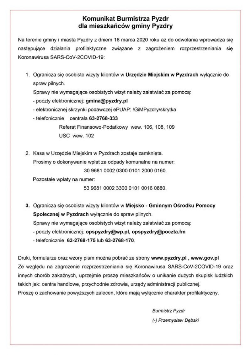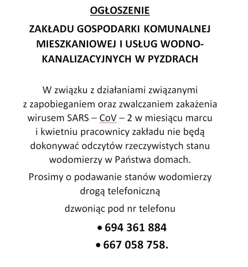 Z dniem 01 marca 2020 roku ulega zmianie stawka opłaty miesięcznej za gospodarowanie odpadami komunalnymi. Podwyżka opłaty podyktowana jest zwiększonymi kosztami jakie ponosi Gmina i Miasto Pyzdry w związku z zagospodarowaniem odpadów przez Zakład w Lulkowie: