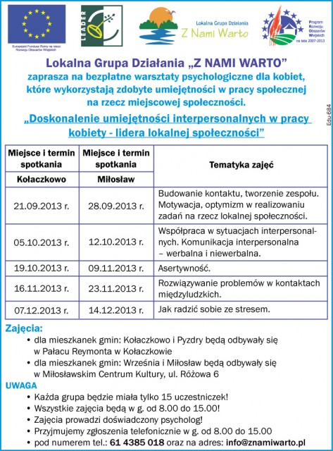 Lokalna Grupa Działania ,,Z nami warto'' zaprasza na bezpłatne warsztaty psychologiczne dla kobiet, które wykorzystają zdobyte umiejętności w pracy społecznej na rzecz miejscowej społeczności.