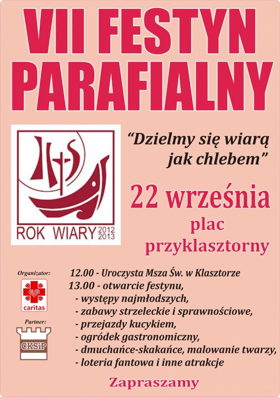 Zapraszamy do wzięcia udziału w Festynie Parafialnym, który odbędzie się 22 września (tj. niedziela) na placu przy Klasztorze.