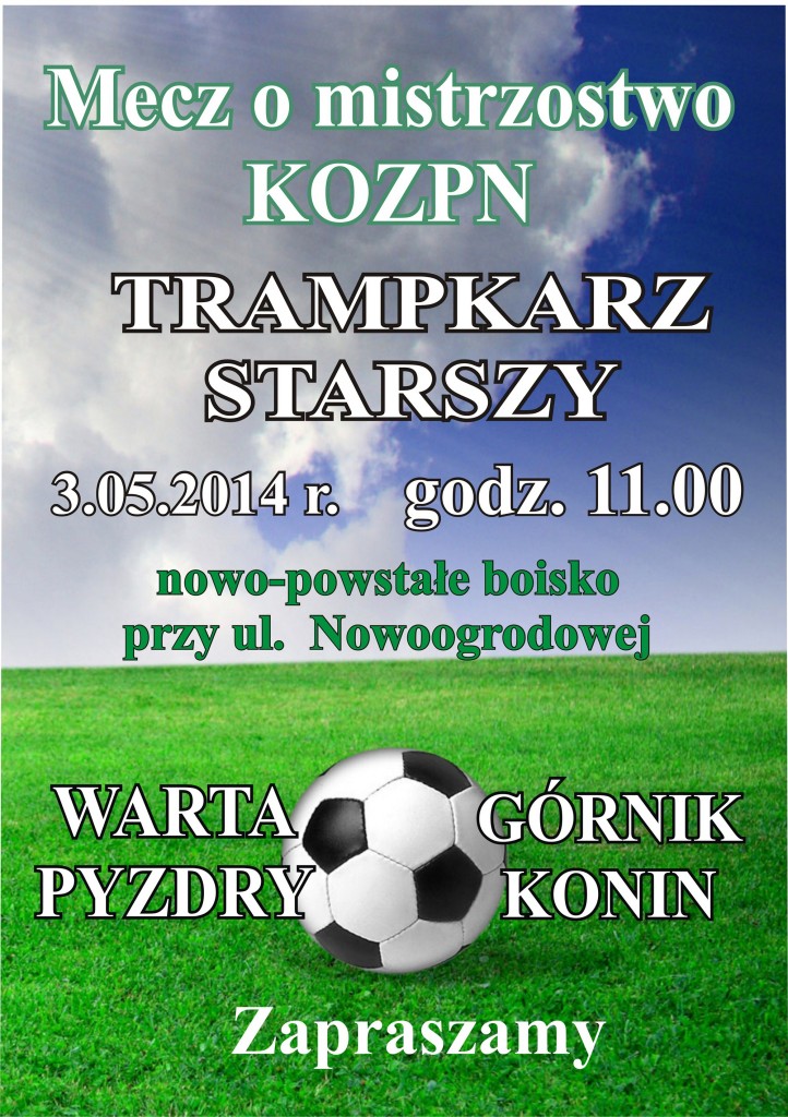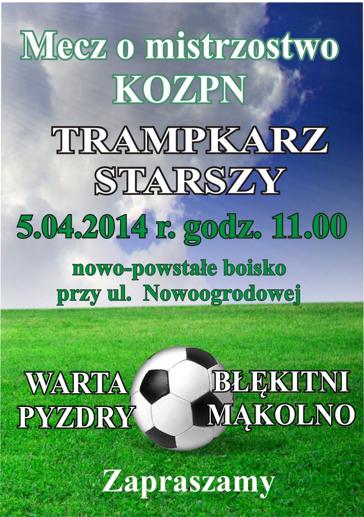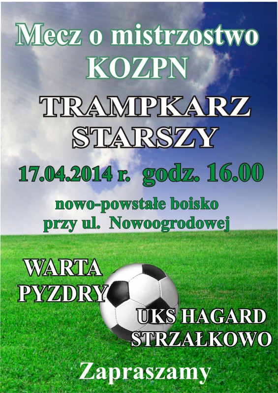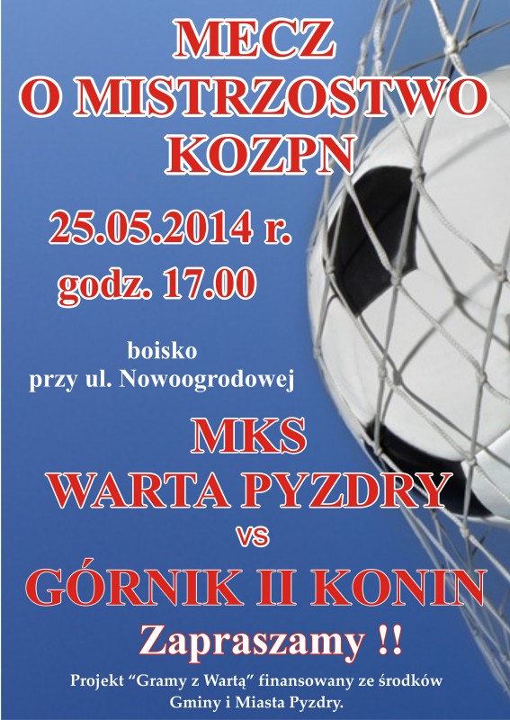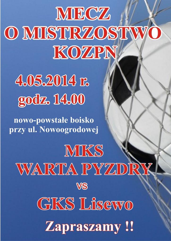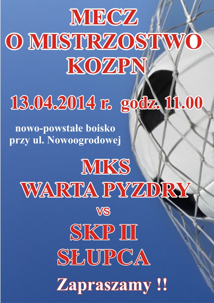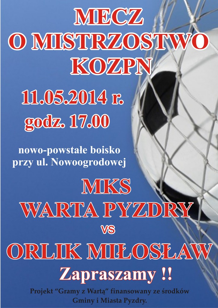 Już w sobotę (19.04.2014 r.) o godz. 11.00 na boisku sportowym przy ul. Nowoogrodowej rozegra się mecz pomiędzy MKS Warta Pyzdry a Sparta Sklejka Orzechowo.