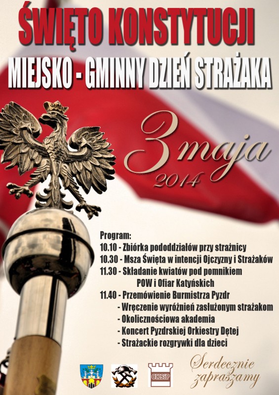 Serdecznie zapraszamy mieszkańców do wzięcia udziału w obchodach Święta Konstytucji i Dnia Strażaka.