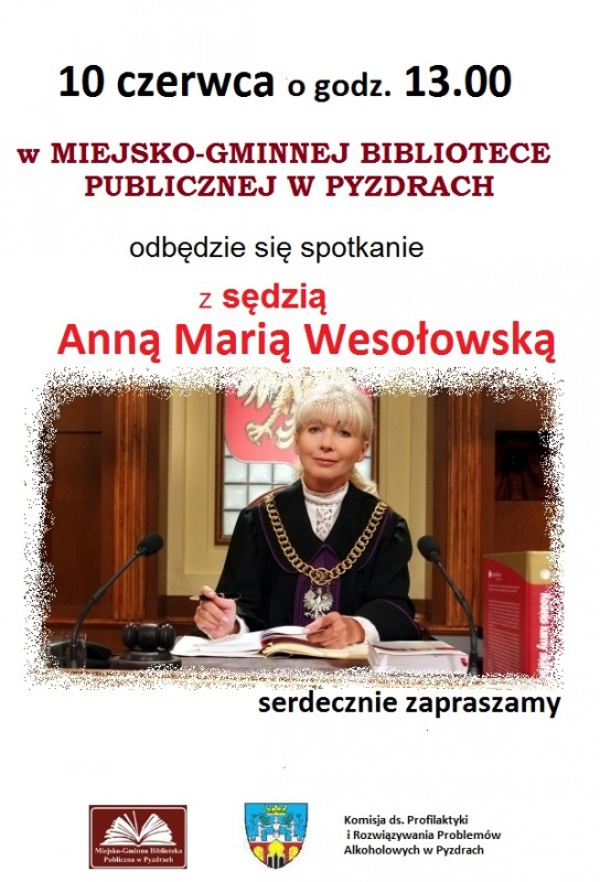 W Miejsko-Gminnej Bibliotece Publicznej w Pyzdrach gościła Sędzia Sądu Okręgowego w Łodzi Anna Maria Wesołowska, która spotkała się z gimnazjalistami i mieszkańcami miasta. Pani Anna występowała w programie "Sędzia Anna Maria Wesołowska", emitowanym na antenie telewizji TVN. Jest autorką felietonów skierowanych do młodzieży na temat prawa, publikowanych w Dzienniku Łódzkim, a w 2008 roku wydała książkę "Bezpieczeństwo młodzieży. Poradnik prawny".