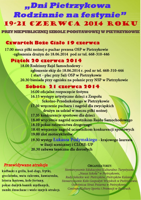 Stowarzyszenie Edukacyjno-Kulturalno-Turystyczne „Nasza Szkoła” wraz z współorganizatorami serdecznie zapraszają na trzydniowy festyn pod hasłem „Dni Pietrzykowa Rodzinnie na festynie”. Potrwa on od 19-21 czerwca. Przewidziano wiele atrakcji m.in. mecz piłki nożnej, rajd samochodowy i występy artystyczne dzieci z miejscowej szkoły. Imprezę uświetni występ Łukasza Podymskiego krajowego laureata w iluzji scenicznej.