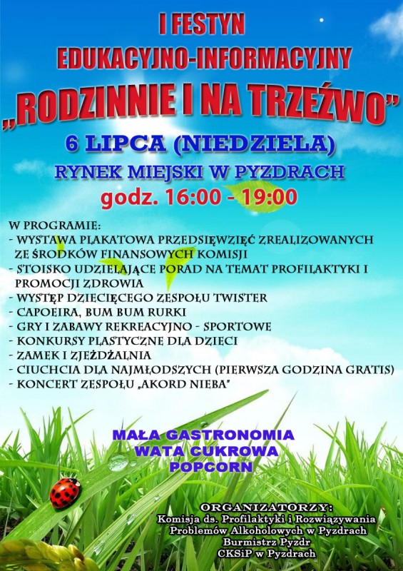 Komisja ds. Profilaktyki i Rozwiązywania Problemów Alkoholowych organizuje I Festyn Edukacyjno-Informacyjny „Rodzinnie i na trzeźwo”. Zapraszamy na Rynek Miejski w Pyzdrach, w niedzielę 6 lipca od godz. 16:00.