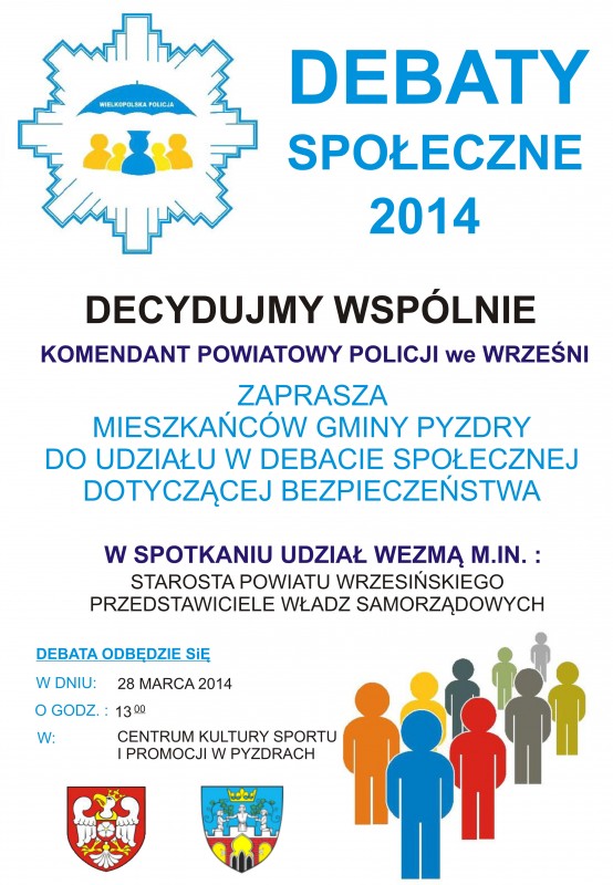 Komendant Powiatowy Policji we Wrześni zaprasza mieszkańców gminy na debatę społeczną dotyczącą bezpieczeństwa. Spotkanie odbędzie się w piątek 28 marca o godz. 13:00 w Centrum Kultury Sportu i Promocji w Pyzdrach.