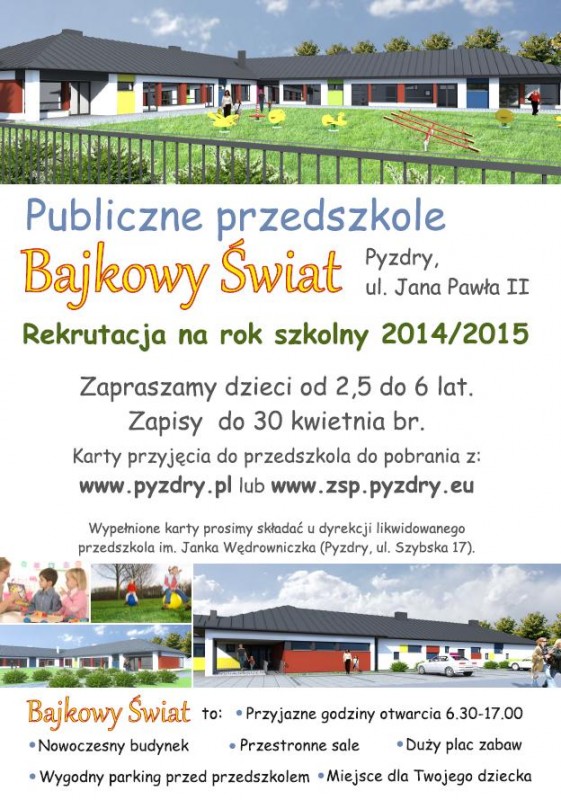 Drodzy Rodzice, publiczne przedszkole BAJKOWY ŚWIAT ogłasza rekrutacje na rok szkolny 2014/2015, dzieci w wieku od 2,5 do 6 lat. Zapisy potrwają do 30 kwietnia br.