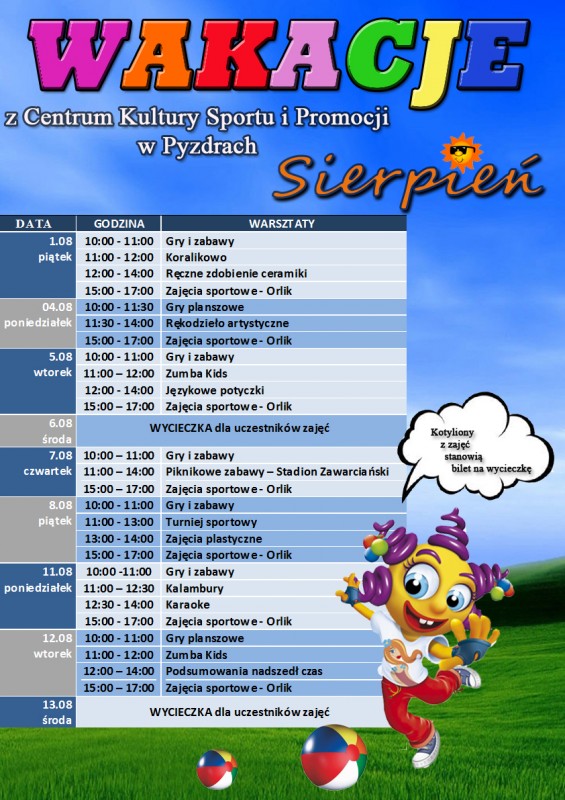 Jako, że wakacyjny, upragniony czas nastał, CKSiP wyszło z propozycją letnich zajęć dla dzieci, łączących gry i zabawy z zajęciami ruchowymi, manualnymi i artystycznymi. Pierwsze z zajęć - Zumba Kids, którą prowadzi wykwalifikowana instruktorka odbyła się, dzięki uprzejmości Dyrektora Zespołu - Romana Dreżewskiego, w salce gimnastycznej miejscowej szkoły. Latynoskie intensywne rytmy i niespotykane wcześniej elementy choreograficzne przypadły do gustu nie tylko dziewczynkom ale i chłopcom. Ci, którzy nie opadli z sił, mogli zaprezentować swoje umiejętności wokalne przy karaoke. W następnym dniu odbył się turniej gry w „Darta”, a zdobywcy pierwszych trzech miejsc otrzymali pamiątkowe medale. Niekwestionowaną atrakcją tegorocznych wakacji są warsztaty ceramiczne, odbywające się w pracowni przy ul. Nadrzecznej. Dzięki dziecięcej wyobraźni powstają nietuzinkowe prace wykonane z gliny. Ponadto, codziennie w godz. popołudniowych, animatorzy prowadzą zajęcia sportowe przy kompleksie boisk „Orlik 2012”.