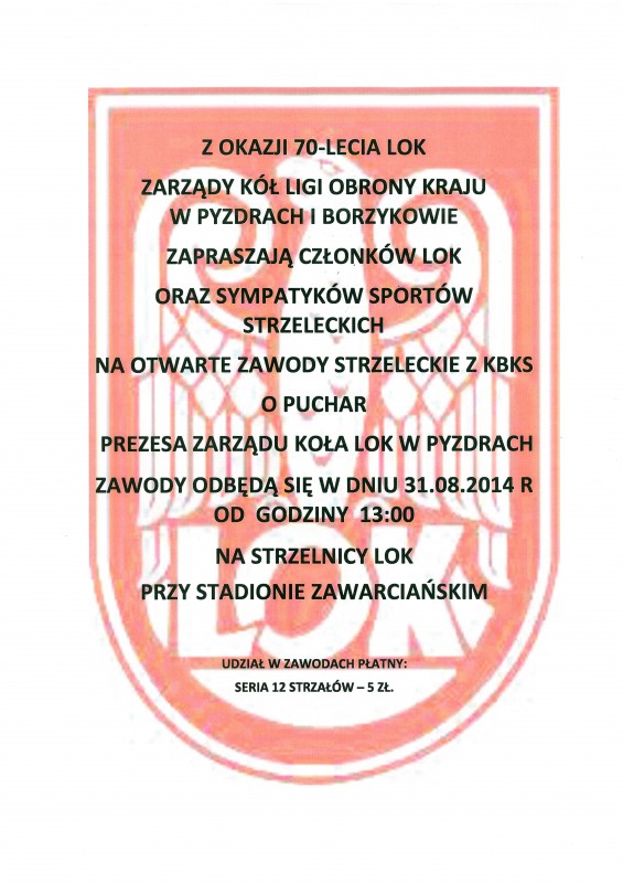 W niedzielę 31 sierpnia z okazji 70-cio lecia LOK odbyły się otwarte zawody strzeleckie z kbks o Puchar Prezesa Zarządu Koła LOK w Pyzdrach. Zawody cieszyły się dużym zainteresowaniem.