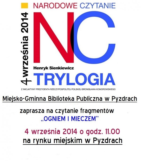 Miejsko-Gminna Biblioteka Publiczna w Pyzdrach zaprasza na czytanie fragmentów Trylogii Henryka Sienkiewicza „Ogniem i Mieczem” dnia 4 września 2014 r. na Rynku Miejskim w Pyzdrach o godz. 11.00. Akcja zorganizowana jest z inicjatywy Prezydenta RP Bronisława Komorowskiego.