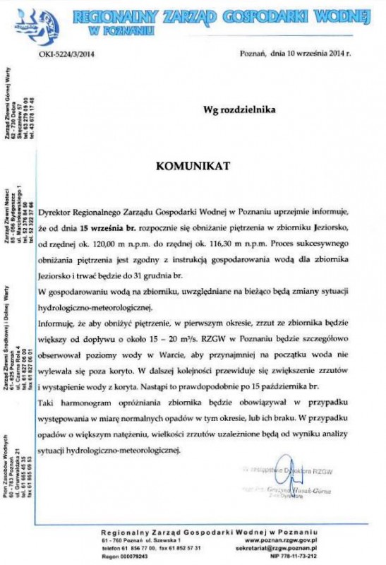 Dyrektor Regionalnego Zarządu Gospodarki Wodnej w Poznaniu uprzejmie informuje, że od dnia 15 września br. rozpoczęło się obniżanie piętrzenia w zbiorniku Jeziorsko od rzędnej ok. 120,00 m n.p.m. do rzędnej ok. 116,30 m n.p.m. Proces sukcesywnego obniżania trwać będzie do 31 grudnia br.