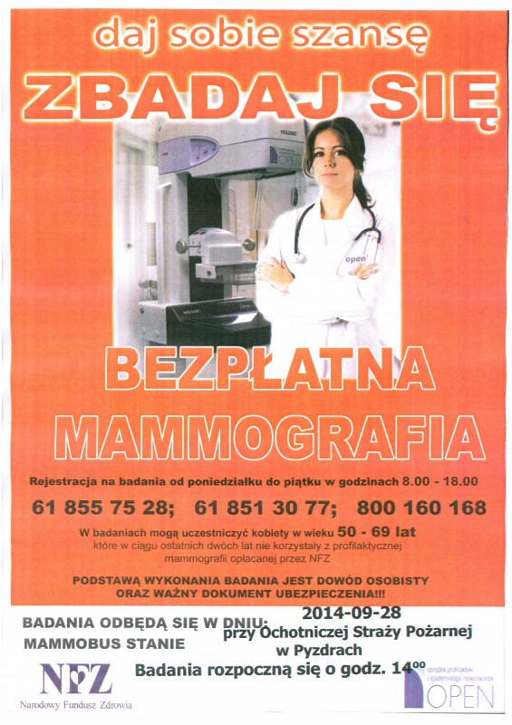 Bezpłatne badanie mammograficzne dla kobiet w wieku od 50. do 69. roku życia odbędzie się 28 września przy Ochotniczej Straży Pożarnej w Pyzdrach.