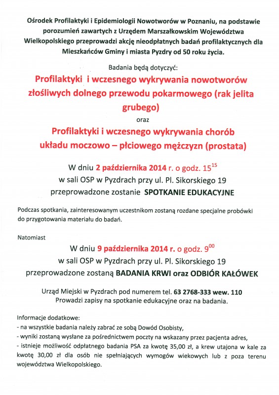Ośrodek Profilaktyki i Epidemiologii Nowotworów w Poznaniu, na podstawie porozumień zawartych z Urzędem Marszałkowskim Województwa Wielkopolskiego przeprowadzi akcję nieodpłatnych badań profilaktycznych dla Mieszkańców Gminy i Miasta Pyzdry od 50 roku życia.