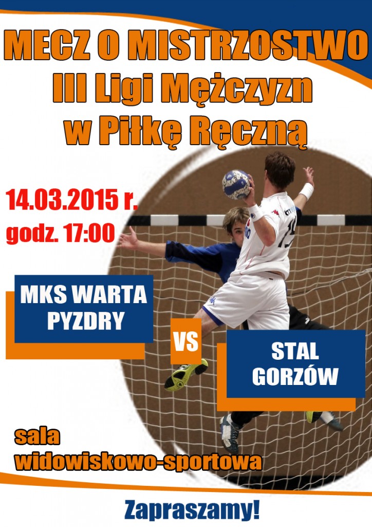 Mecz piłki ręcznej odbędzie się 14 marca 2015 o godz. 17.00 w sali widowiskowo sportowej w Pyzdrach. O mistrzostwo III ligi mężczyzn walczyć będą MKS Warta Pyzdry i Stal Gorzów.