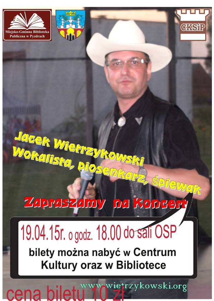 Zapraszamy na koncert Jacka Wietrzykowskiego ,,W rytmie country'' 19 kwietnia o godz. 18.00 w sali OSP. Cena biletu 10 zł. Bilety można nabyć w Centrum Kultury oraz w Bibliotece lub bezpośrednio przed koncertem w sali OSP.