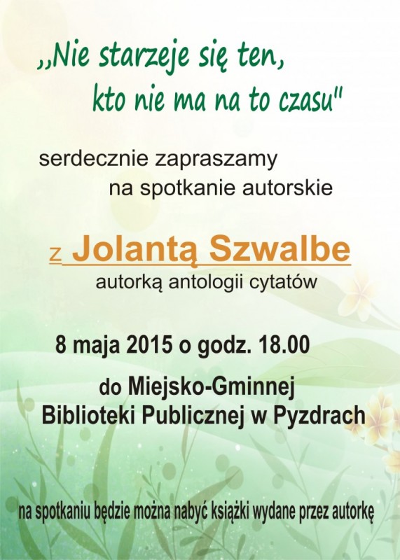 Biblioteka zaprasza na spotkanie z Jolantą Szwalbe - autorką antologii cytatów, zaś Muzeum zaprasza na wystawę fotograficzną Karola Budzińskiego "Wielkopolska - tu warto być, to warto zobaczyć".