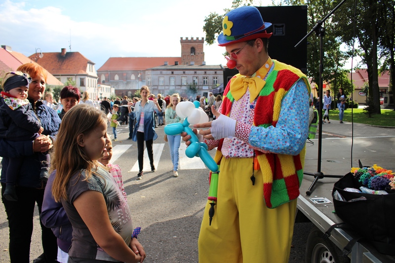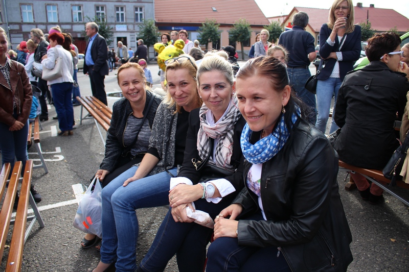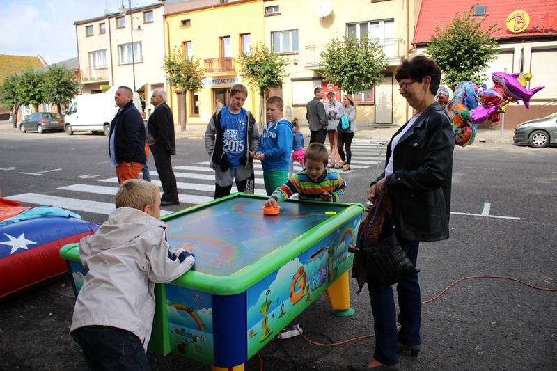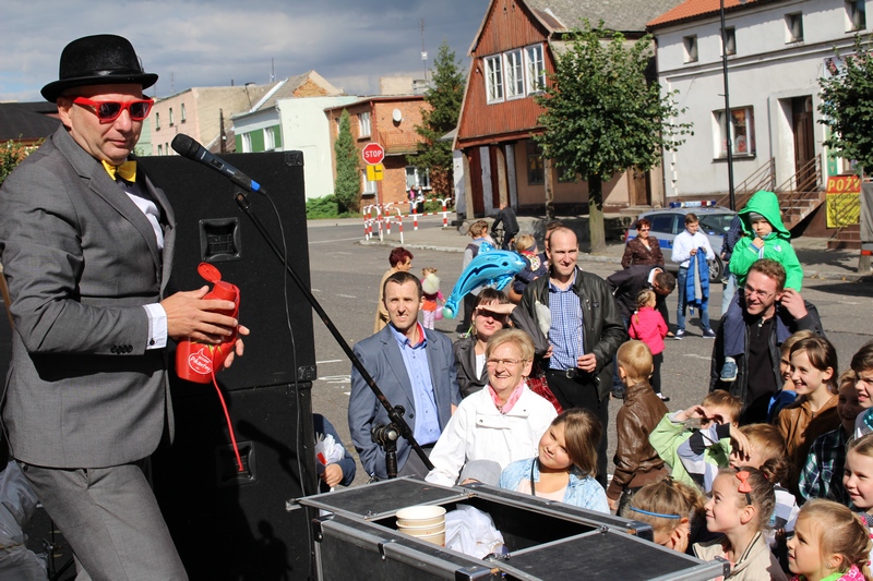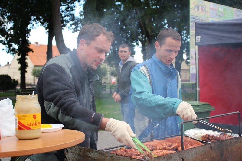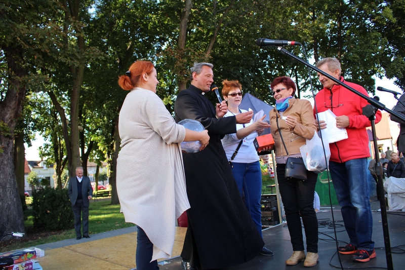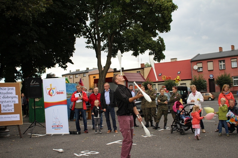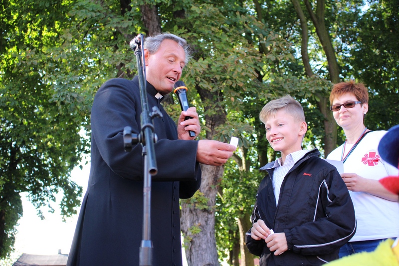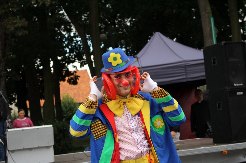 Po niedzielnej Mszy św. wierni zgromadzili się na rynku, by korzystać z wielu atrakcji. Każdy mógł znaleźć coś dla siebie, bo to przecież festyn rodzinny. Ks. Proboszcz Ryszard Kopczyński przywitał zebranych życząc sobie i innym dobrej zabawy. Śpiewająco jako pierwsza na scenie zaprezentowała się grupa Motylków z przedszkola, a także Maja Jercha i Weronika Czerwińska. Chwile po nich mikrofony przejął Akord Nieba wraz ze scholą i ks. Pawłem Haczyńskim. W związku ze zbliżającymi się Światowymi Dniami Młodzieży w Krakowie, grupa wolontariuszy ze Strzałkowa zachęcała do włączenia się w akcję „Bilet dla Brata”. Swoje umiejętności z zakresu samoobrony prezentowali uczniowie szkoły o profilu wojskowym ze Wrześni. O zabawę przede wszystkim dla dzieci zadbała grupa animatorów: szczudlarz, żongler, iluzjonista i klaun Kuki. Zgodnie możemy stwierdzić, że mieszkańcy naszej gminy posiadają świetne poczucie humoru. Nie lada gratką były odwiedziny Klubu Miłośników Syren i Warszaw z Nekli. Mogliśmy dzięki nim podziwiać piękne cudeńka z czasów PRL-u od Syreny po Trabanta. A nieco nowocześniejszą niespodzianką były motocykle. Znalazł się wśród nich również najmłodszy miłośnik szybkiego sprzętu Bartek Jankowski.