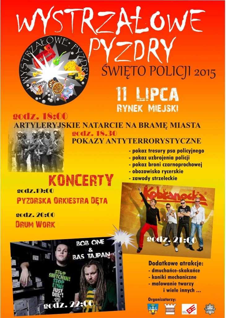 Serdecznie zapraszamy na zbliżające się wielkimi krokami kolejne wydarzenie. 11 lipca na Rynku Miejskim będą miały miejsce ,,Wystrzałowe Pyzdry'' - impreza połączona z Świętem Policji. Przygotowaliśmy dla Państwa moc atrakcji, dlatego też nikogo z Was nie może na niej zabraknąć.