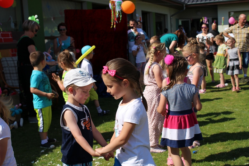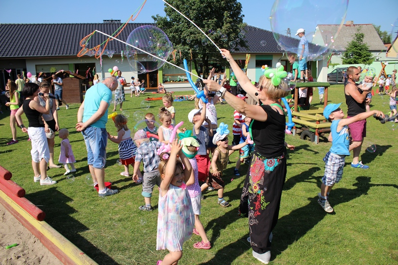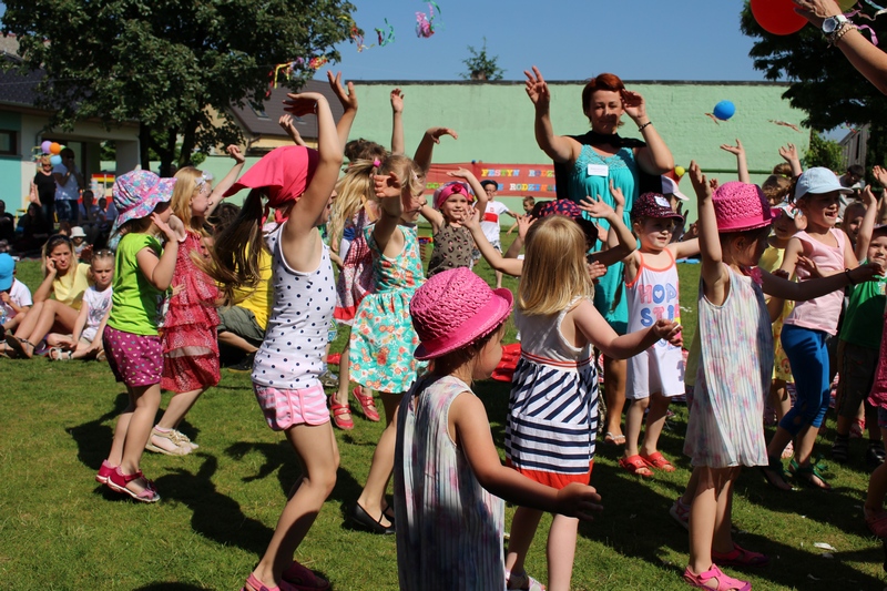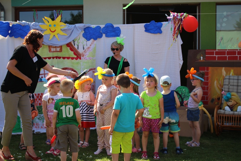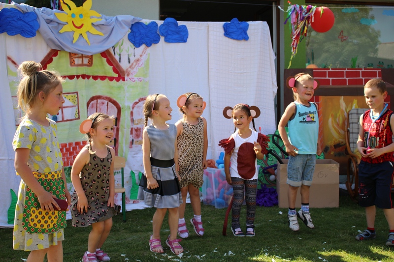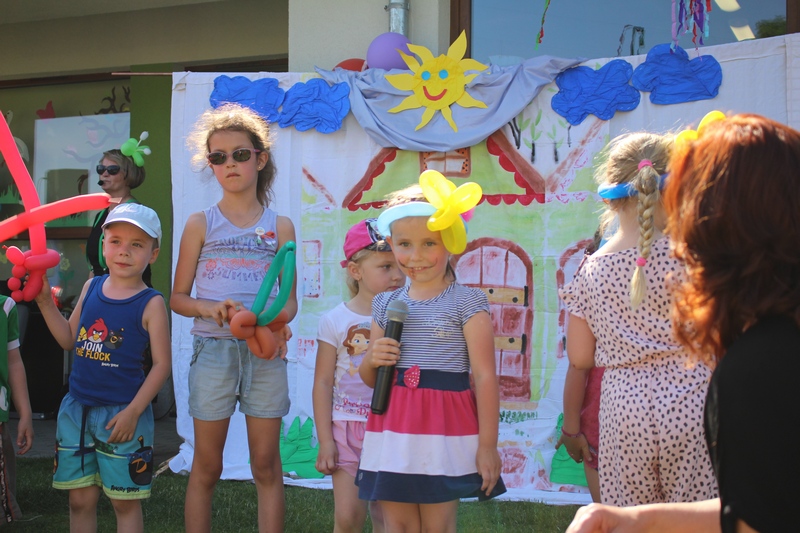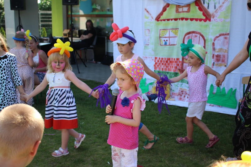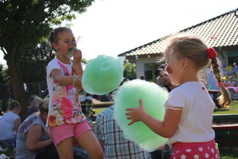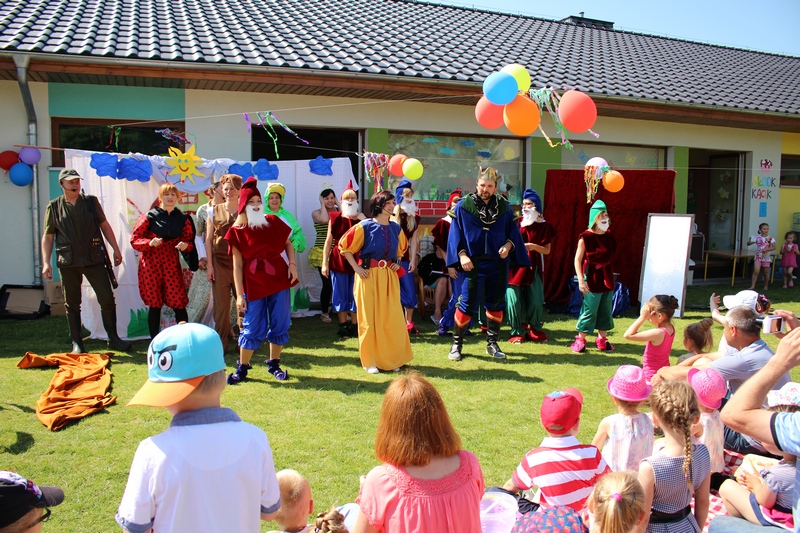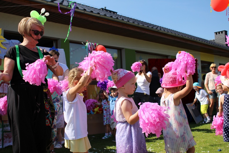 Festyn rozpoczął spektakl przygotowany przed rodziców i wychowawców grup przedszkolnych. Bajka o Królewnie Śnieżce i 7 Krasnoludkach była wystawiona po raz drugi. W postacie bajkowe wcielili się sami rodzice i wychowawcy wraz z dyrektorem placówki. Dzieci z zaciekawieniem słuchały przedstawienia. Kolejną częścią programu był występ finalistów Konkursu Piosenki Bajkowej. Najmłodsi bez żadnych problemów przedstawili swoje zdolności wokalne przed tak liczną publicznością. Pokazali w ten sposób, że trema im niestraszna. Na najmłodszych uczestników zabawy czekało wiele niespodzianek: balony, słodkości, malowanie twarzy. Nie mogło zabraknąć swojskiego jadła, kiełbaski z grilla czy słodkości. Największe kolejki ustawiały się do waty cukrowej i popcornu.
