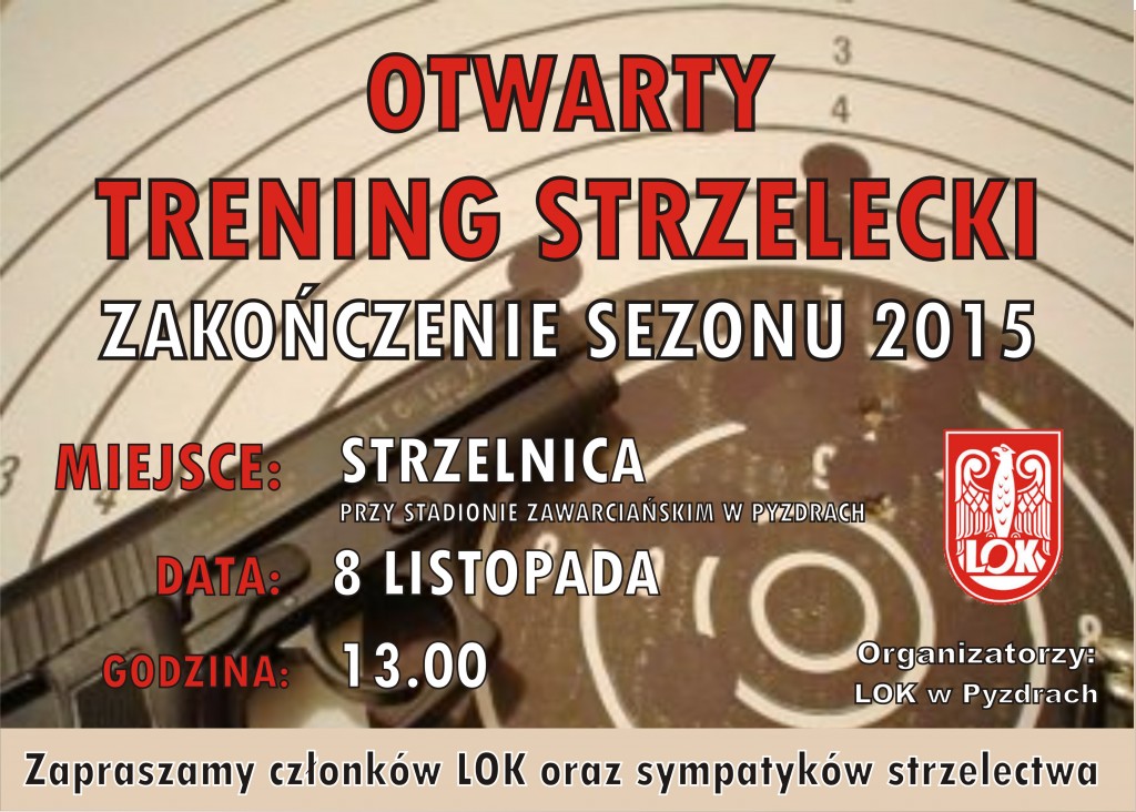 Członków LOK oraz sympatyków strzelectwa zapraszamy na otwarty trening strzelecki „Zakończenie sezonu 2015”, który odbędzie się w niedzielę, 8 listopada na Strzelnicy przy Stadionie Zawarciańskim w Pyzdrach.