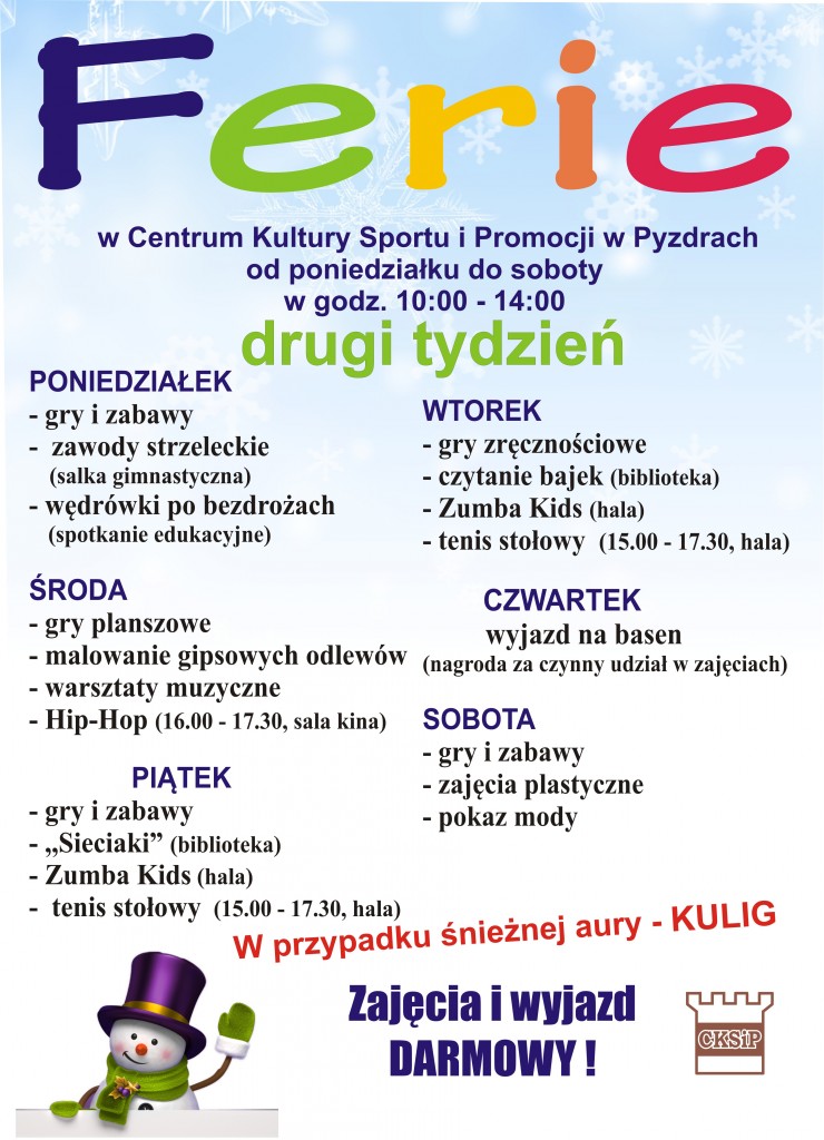 Przed nami drugi tydzień ferii. Zachęcamy wszystkie dzieci – także te, które jeszcze nas nie odwiedziły, do udziału w zajęciach organizowanych przez Centrum Kultury Sportu i Promocji.