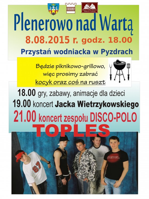 Już w najbliższą sobotę - 8 sierpnia, na przystani wodniackiej w Pyzdrach odbędzie się impreza ,,Plenerowo nad Wartą'', zaczynamy o godz. 18.00.