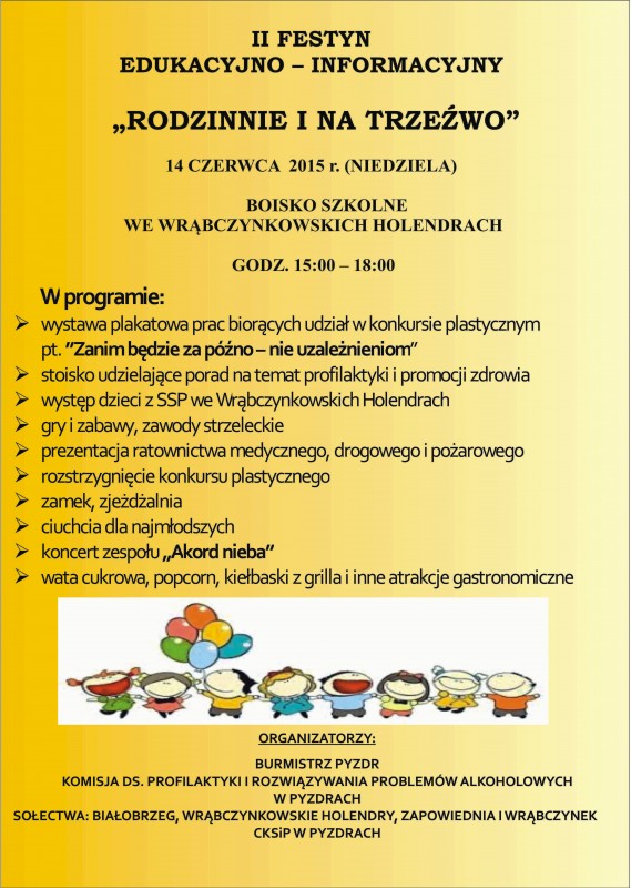 Zapraszamy na II Festyn Edukacyjno-Informacyjny "Rodzinnie i na trzeźwo". Festyn odbędzie się 14 czerwca na boisku szkolnym przy SSP we Wrąbczynkowskich Holendrach. Szczegóły w załączeniu.
