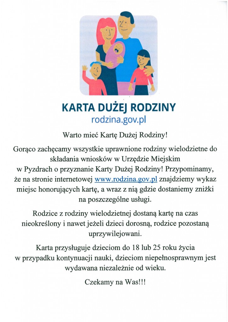 Gorąco zachęcamy wszystkie uprawnione rodziny wielodzietne do składania wniosków w Urzędzie Miejskim w Pyzdrach o przyznanie Karty Dużej Rodziny!