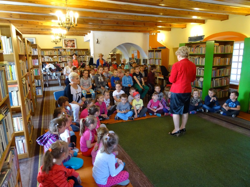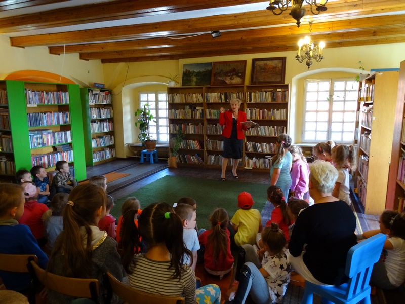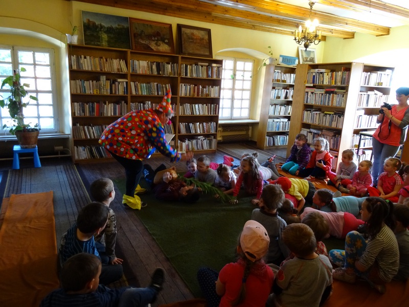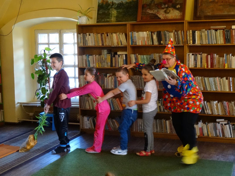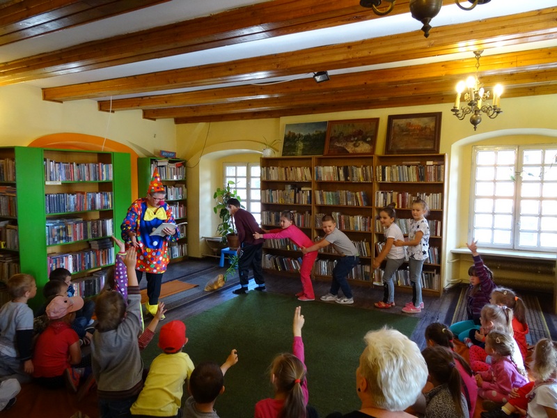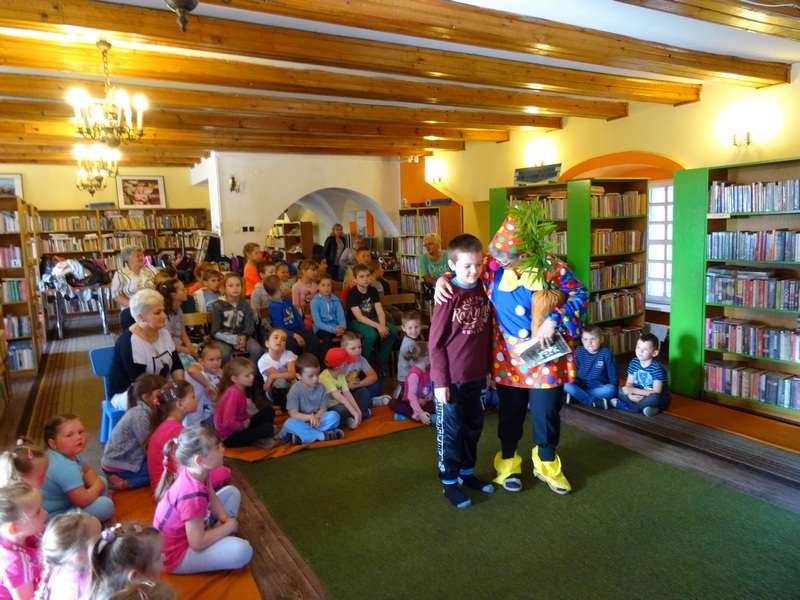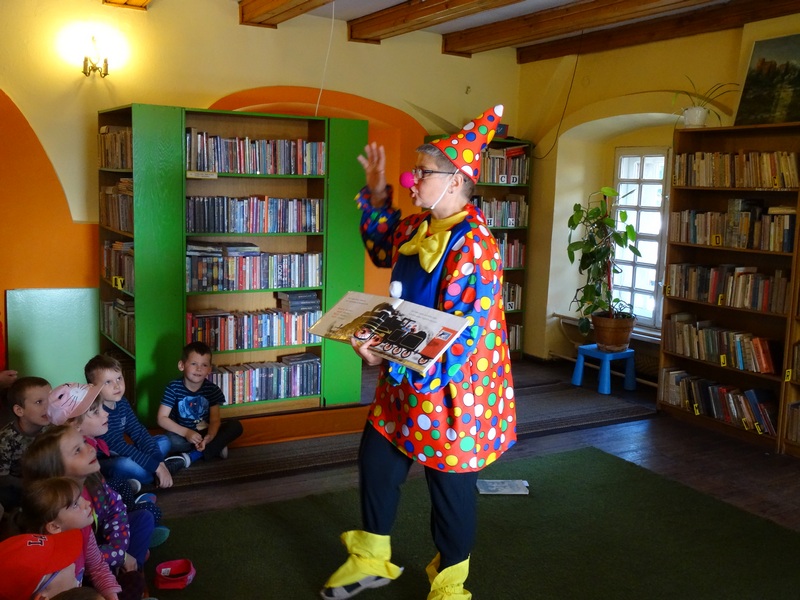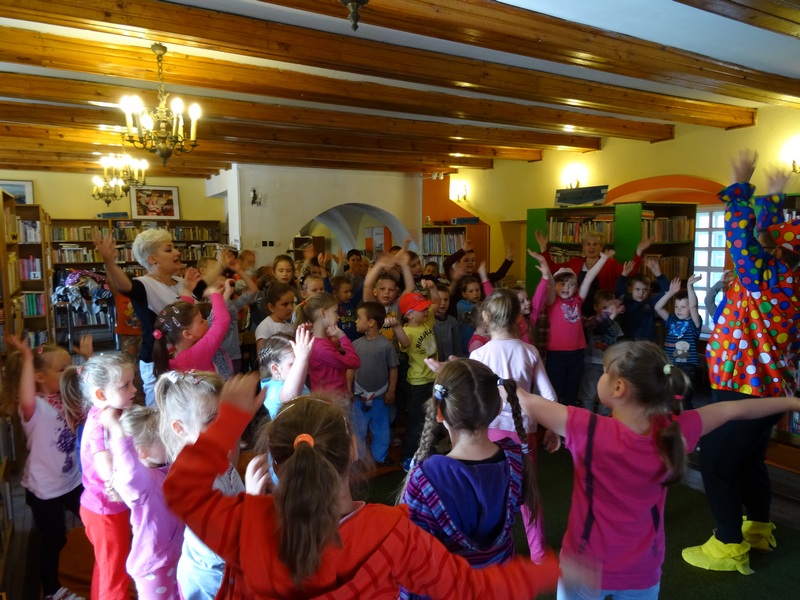 Przygotowaliśmy dla nich niespodziankę, a mianowicie wizytę klauna. W tę rolę wcieliła się już po raz kolejny Barbara Sulkowska, która w kontakcie z dziećmi oddaje całe swoje serce i energię. Mali goście byli zachwyceni i z wielką uwagą słuchali czytanych przez klauna bajek, takich jak: „Lokomotywa”, „Dwa Michały”, „Rzepka”, „Okulary”. Nie zabrakło również tańców, pląsów i śpiewania piosenek. Na zakończenie Dyrektor Biblioteki przeprowadziła z dziećmi pogadankę edukacyjną na temat książek znajdujących się w bibliotece.