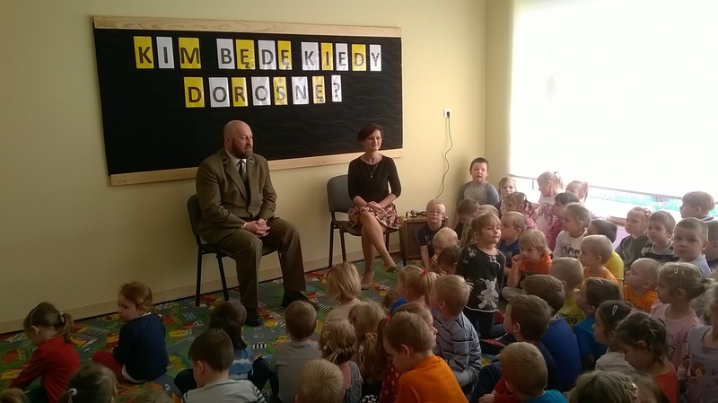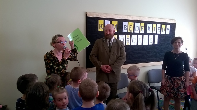 Gość zaprezentował mundur leśniczego, opowiedział o swojej pracy oraz udzielał odpowiedzi na bardzo interesujące pytania: Jakie zwierzęta żyją w lesie?, Które z nich jest największe?, Z czego zbudowana jest leśniczówka?, Czy pan leśniczy spotkał w lesie żabę?, Czy uratował Czerwonego Kapturka?. Odpowiedź na ostatnie pytanie była twierdząca. Pan Dariusz dodał nawet, że babcię też uratował.