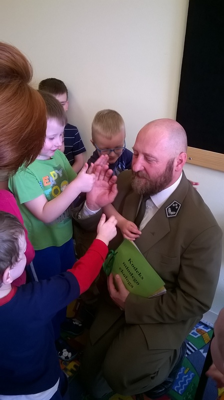 Dzieci w podziękowaniu za odwiedziny, zaśpiewały kilka piosenek i zaprosiły gościa do wspólnej zabawy. Wręczyły również upominek – ilustrowany „Kodeks Młodego Ekologa””, w którym zawarte były obietnice przedszkolaków dotyczące dbania o środowisko.