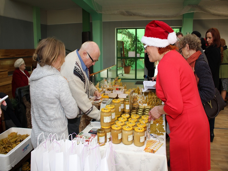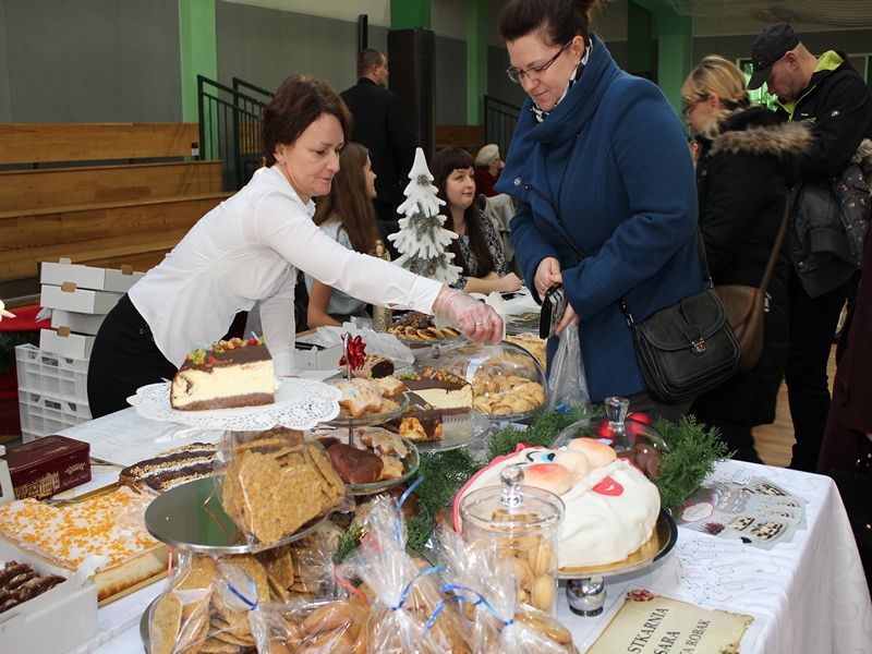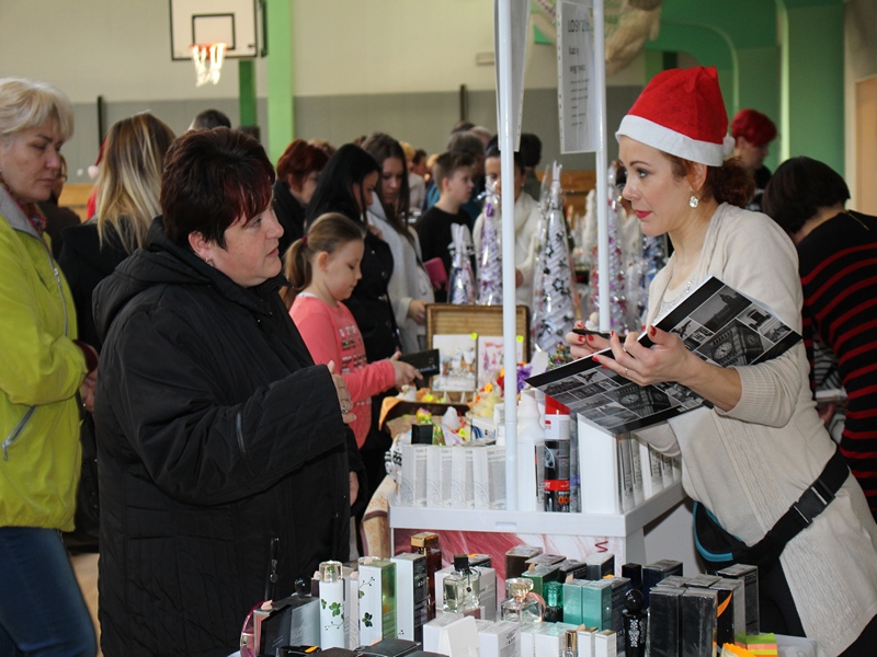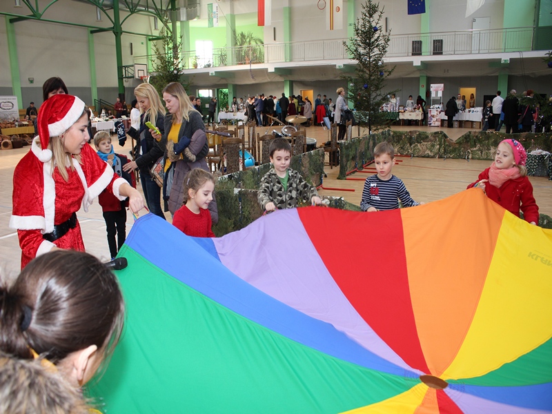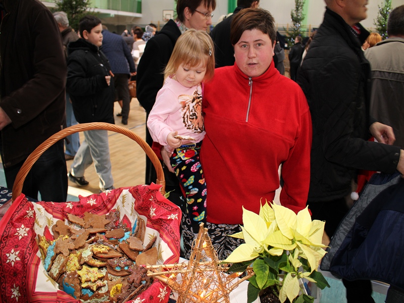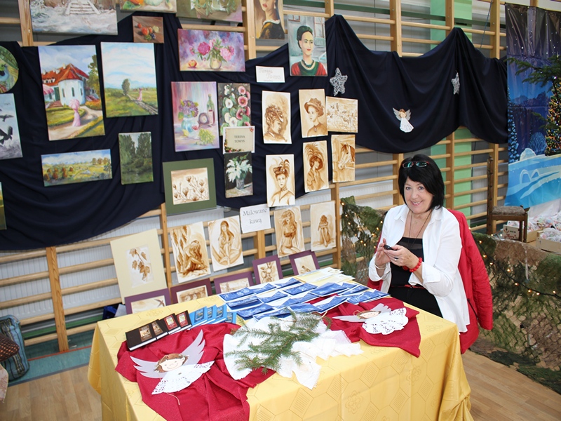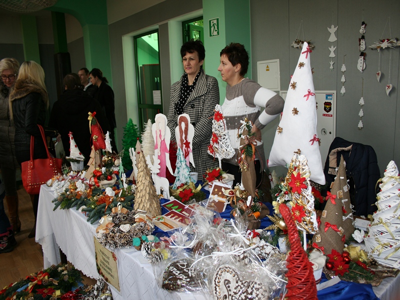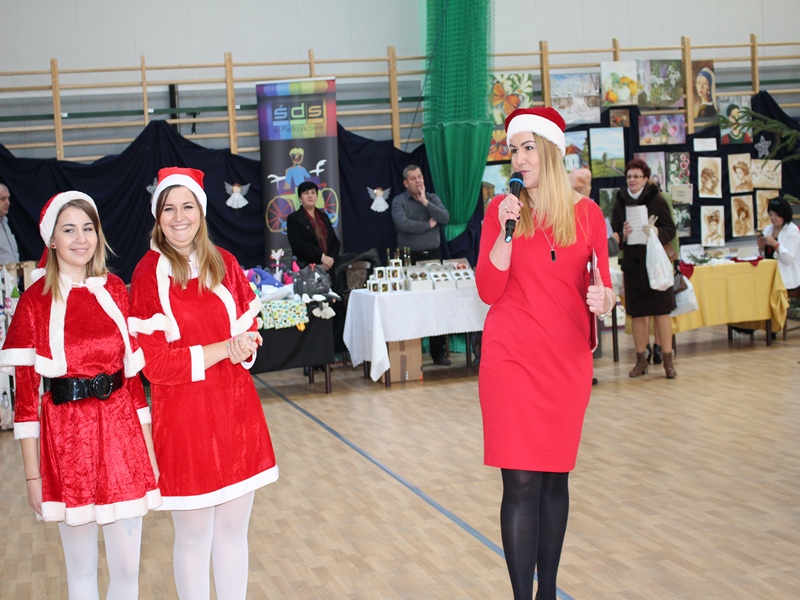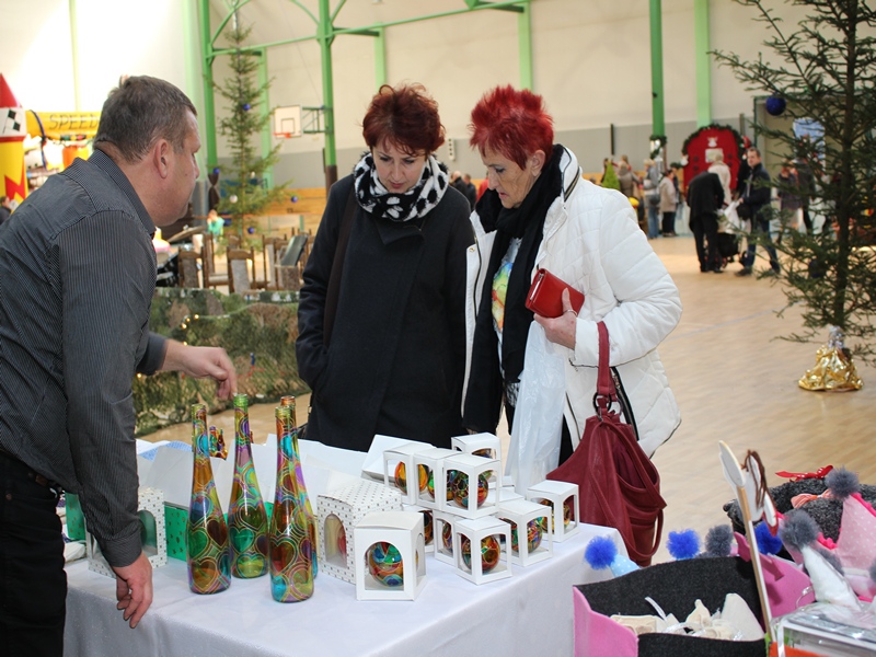 Świąteczna impreza odbyła się w sali widowiskowo-sportowej. Przestronny obiekt spełnił nasze oczekiwania. W tym samym miejscu i w tym samym czasie przeprowadziliśmy zarówno kiermasz handlowy, jak i wesołą zabawę dla najmłodszych. Dorośli mogli wybierać prezenty dla najbliższych i szukać prostych dekoracji, by ich dom stał się przytulny i radosny na święta. Pomysłów i inspiracji było mnóstwo. Od papierowych choinek, artystycznych bombek czy gipsowych aniołków, po kubki ręcznie malowane, cuda z pszczelej pasieki, ubrania i biżuterię. Słowem – dla każdego coś fajnego. Nie sposób wszystkiego wymienić. Wystawcy zaoferowali przedmioty z duszą. Niektórzy dostali się do naszych serc przez żołądek serwując swoje kulinarne specjały. A jeszcze inni nakłonili nas do okazywania serca i wsparcia potrzebujących. Chyba wszyscy poczuliśmy magię nadchodzących świąt, podkreśloną muzycznym akcentem orkiestry i uczestniczek zajęć wokalnych.