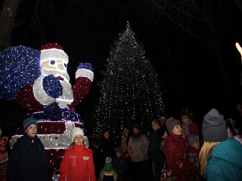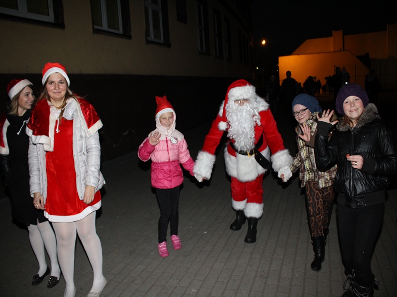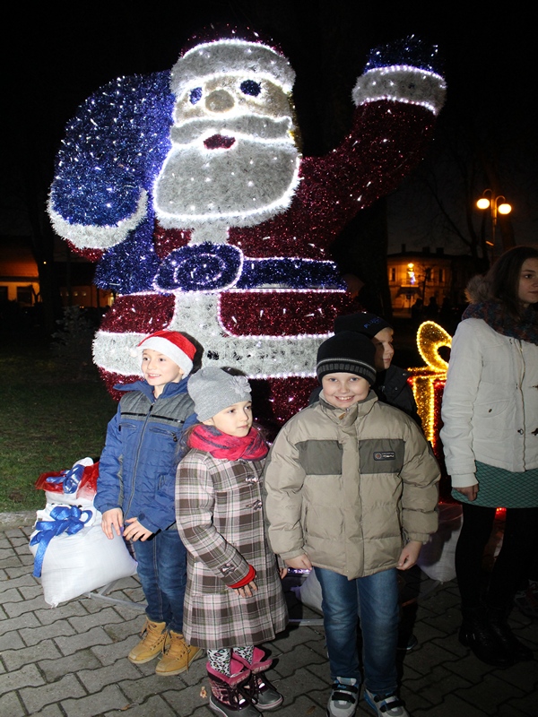 Dopełnieniem imprezy było zapalenie iluminacji świetlnej w centrum miasta. Zabłysła piękna choinka, gigantyczny mikołaj z prezentem oraz elementy dekoracyjne na lampach stylowych i urzędzie. Po wysłuchaniu życzeń od Burmistrza wszyscy rozeszliśmy się w iście świątecznej atmosferze.