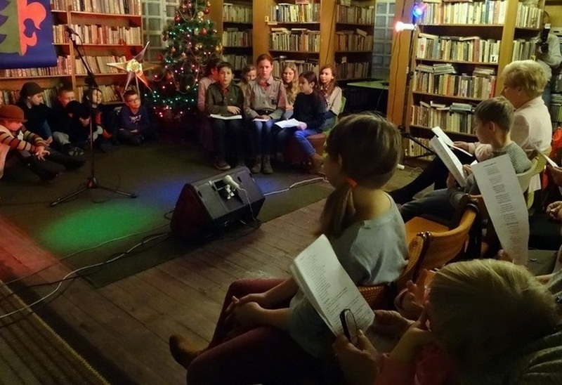 Wspólny śpiew jednoczy serca, dlatego aby zachęcić do wspólnego kolędowania rozdaliśmy naszym gościom mini śpiewniki. Ciepły nastrój i radośnie brzmiące dźwięki udzieliły się wszystkim obecnym. Już po chwili w bibliotece rozbrzmiał kilkudziesięcioosobowy chór, którego śpiew słychać było poza murami biblioteki.