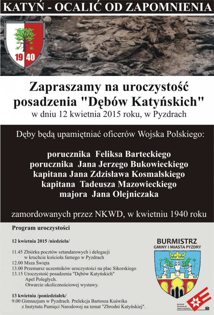 W dniu 12 kwietnia 2015 r. na Placu Sikorskiego w Pyzdrach, posadzone zostaną DĘBY PAMIĘCI poświęcone pięciu bohaterom związanych z naszym miastem i okolicą - zamordowanym w Katyniu, Miednoje i Charkowie: