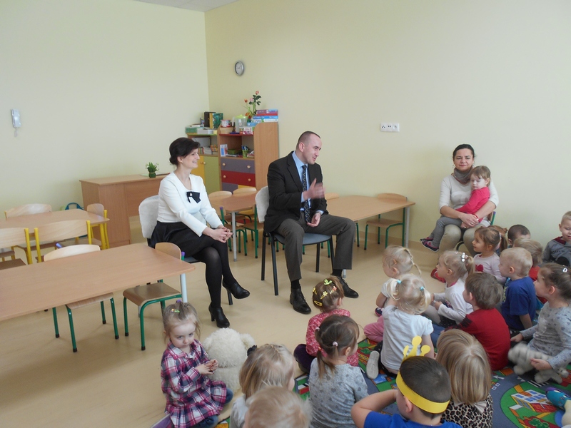 Pierwsze z nich miało miejsce 10 marca. Jego gościem był Burmistrz Pyzdr Przemysław Dębski. Przedszkolaki chcąc dowiedzieć się jak najwięcej chętnie zadawały różne pytania, np. Czy łatwo jest być burmistrzem?, Co to jest gmina?, Po co rośniemy? Czy burmistrz lubi kwiaty? Czy był kiedyś kowbojem? Czy ma pieniążki? Czy ma przerwy w pracy?. W ramach podziękowań za poświęcony im czas, dzieci zaśpiewały piosenkę o wiośnie i podarowały burmistrzowi album "Moje miasteczko Pyzdry", w którym umieszczone zostały rysunki utalentowanych plastycznie przedszkolaków przedstawiające pyzdrski most, kościół farny, pomnik POW, przedszkole i inne. Na zakończenie każdy został obdarowany przez Burmistrza zdrowym soczkiem i zaproszony na rewizytę do jego miejsca pracy - Urzędu Miejskiego.