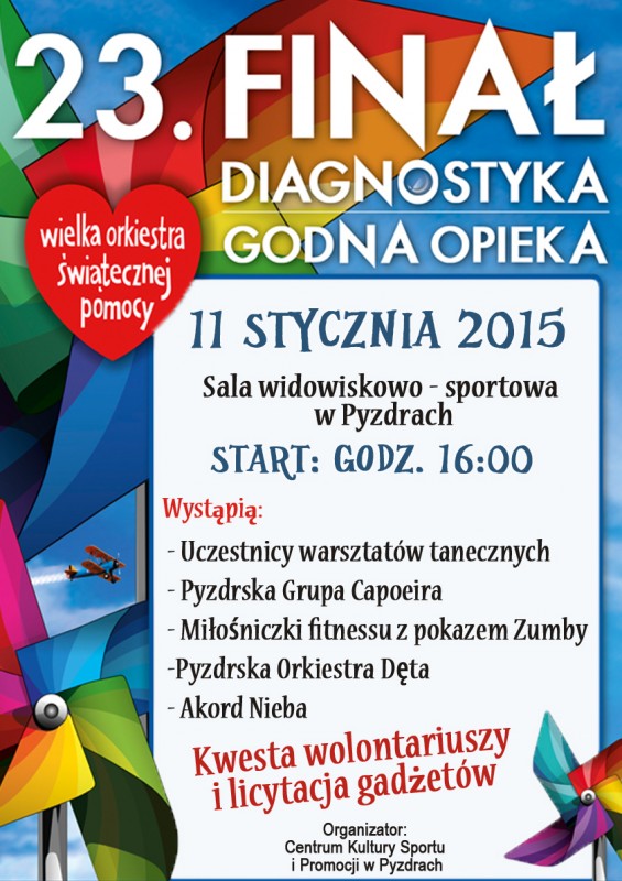W najbliższą niedzielę odbędzie się 23. Finał Wielkiej Orkiestry Świątecznej Pomocy, w który tradycyjnie włączyła się gmina Pyzdry. Od wczesnych godzin rannych, wolontariusze wyposażeni w identyfikatory i puszki będą kwestować, aby wspomóc tą szczytną akcję. Natomiast od godz. 16.00, w sali widowiskowo - sportowej zaprezentują się lokalni wykonawcy, których występy przeplatane będą licytacją gadżetów.